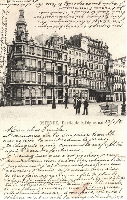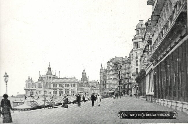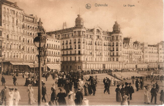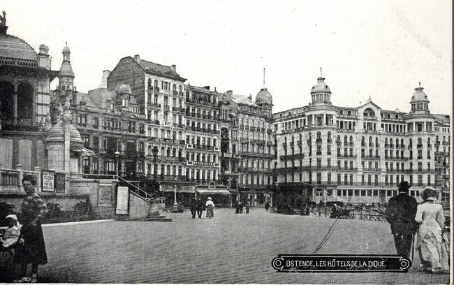Ostende, la digue centrale. De Zeedijk richting havengeul. Rechts Hôtel du Littoral op de hoek met de Hertstraat