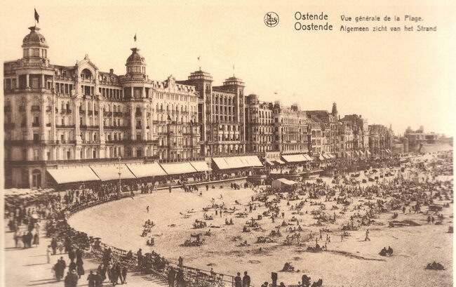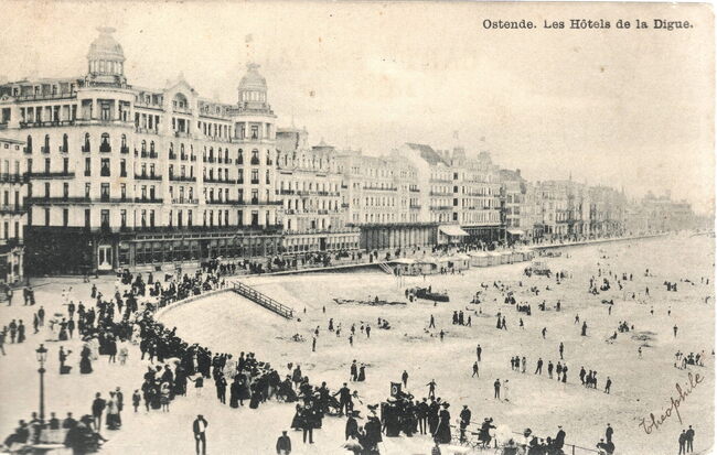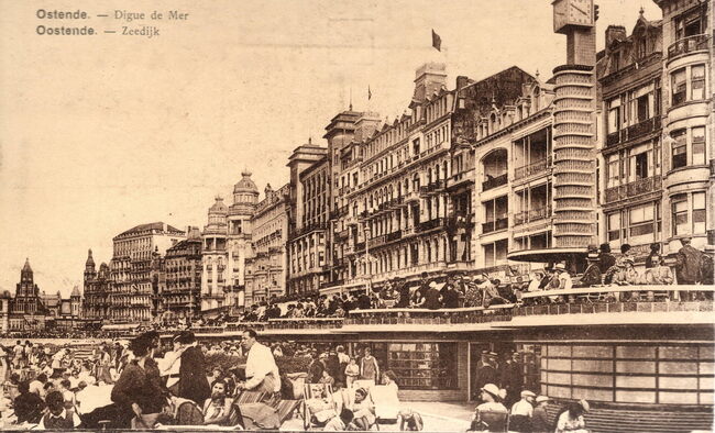 Ostende, la plage. Kinderen maken een fort (zandkasteel) tegen het opkomend water (vloed), de badkarren tegen de zeedijk. De Zeedijk met de grote hotels, het Koninklijk Chalet en op het einde het Royale Palace Hotel…