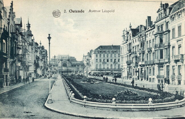 Albert Dohmen 2. - Ostende Avenue Léopold. De Leopoldlaan gezien richting de hoofdingang van het kursaal. Let op de altijd verzorgde bloemenparken door de groendienst van de stad