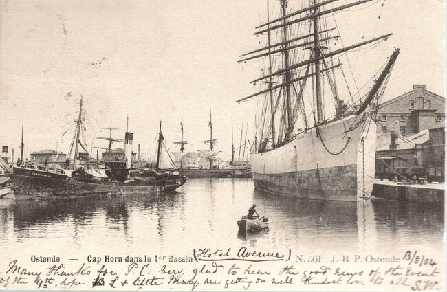 Provost/J.B.P. N 561. - Ostende - Cap Horn dans le 1er Bassin. Rechts, een Kaap Hoorn-vaarder gemeerd langs de Keizerskaai nabij de stedelijke opslagplaatsen. Zij voerden guano (natuurlijke meststof) in uit Chili…