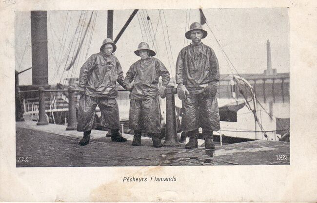 Ostende - Bassin des Pêcheurs. Vissersvaartuigen aangemeerd in het Schuildok langs de Visserskaai. Op de Visserskaai staan de wagons van de vistreinen