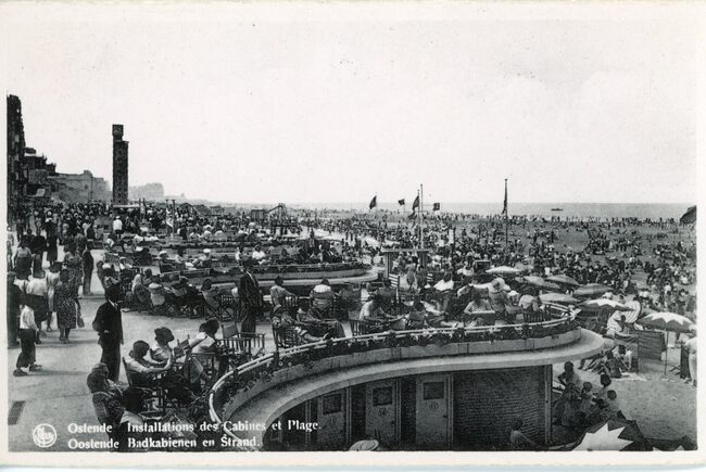 Albert Dohmen 4. - Plage et digue. Strandrecreatie op het groot strand nabij de badinstallaties onder de Albert I-promenade. Op het einde, detail van de westgevel van het vierde Kursaal