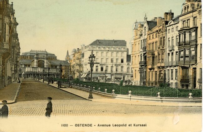Grand Bazar, 1100. - Ostende - Avenue Léopold et Kursaal. - Bijgekleurde kaart. De Leopoldlaan met zijn sierlijke straatverlichting en verzorgde bloemenperken, gezien vanaf de Karel Janssenslaan richting de…