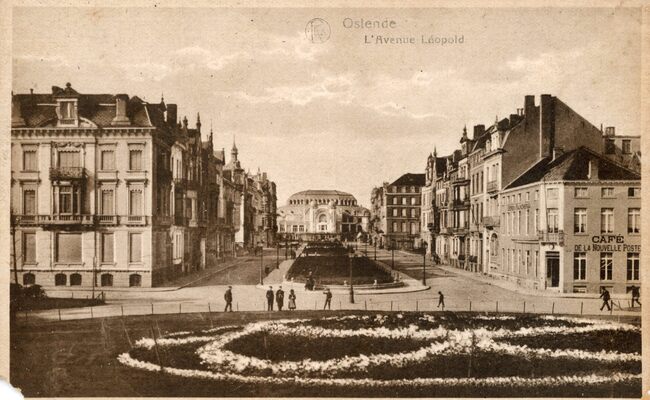 REX/M.B.C.P.) - Ostende - L'Avenue Léopold. De Leopoldlaan gezien vanuit het Leopoldpark met op het einde het tweede kursaal. Links de Karel Janssenslaan. Rechts, op de hoek van met de Wittenonnenstraat, Café …