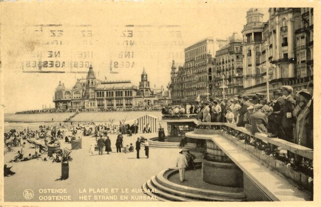 Arfo. - Ostende - Le Kursaal et la Digue. Het groot strand nabij de westelijke gevel van het derde Kursaal gelegen langs de Zeedijk.