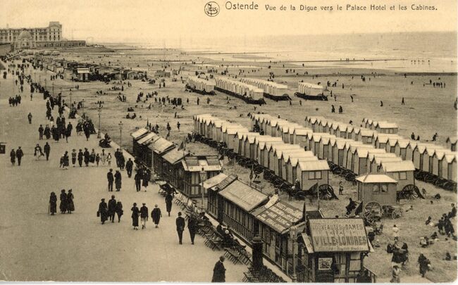 Nels. - Ostende - Vue de la Digue vers le Palace hôtel et les Cabines. Strandrecreatie op het groot strand ten Westen van het kursaal richting het Royal Palace Hotel. Links de Zeedijk. Badkarren op het strand.