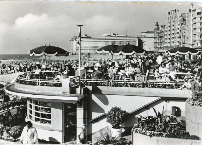 Nels. - De westgevel van het vierde Kursaal langs de Albert I-Promenade. Een amfibieboot op het groot strand.