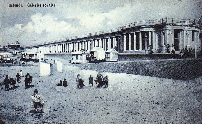 Daveluy. - Ostende - Galeries royales. We zien de 366 m. lange wandelgalerij, met op het einde een paviljoen, met twee salons en aan de binnenzijde onderbroken door twee tussenliggende halve paviljoenen. De…