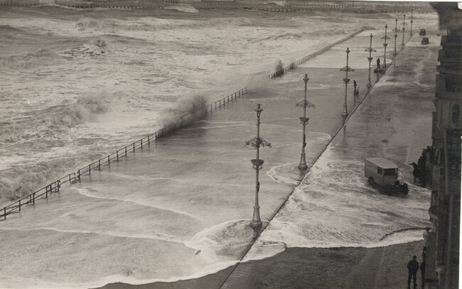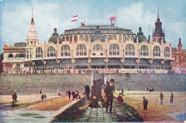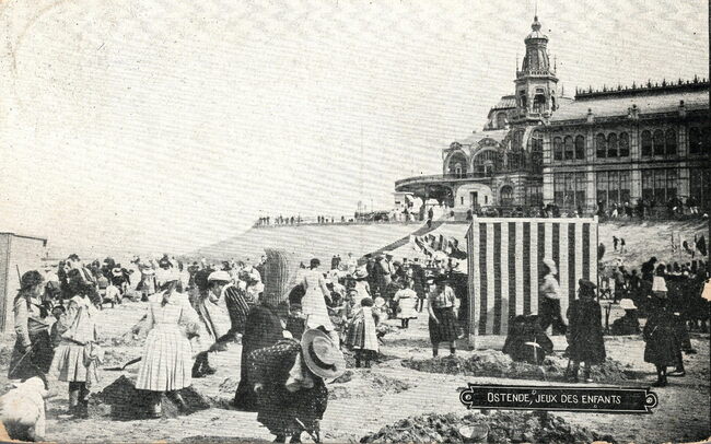 Victor Grégoire/V.G. - Ostende, jeux des enfants. Kindespelen op het groot strand. Detail van de westgevel van het derde Kursaal. Die witte vlek is een voorlopig gevolg van de verbouwing. Die witte muur sloot de…