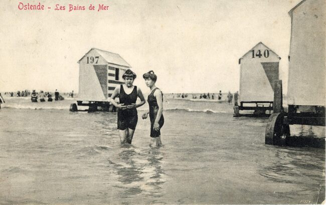 Victor Grégoire/V.G. - Ostende - Les bains de mer. - Twee vrouwen doen aan pootjebaden. We zien de traditionele badkarren.