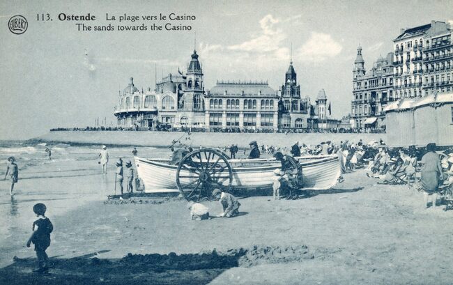 Albert Dohmen 113. - Ostende - La plage vers le Casino. The sands towards the Casino. Rechts, detail van twee luxe badkarren en in het midden de reddingssloep van de strandreddingsdienst. De westelijke gevel van het…