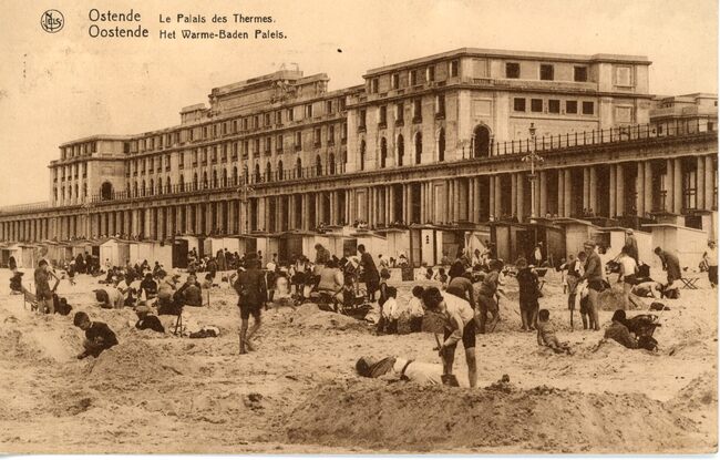 Nels - Ostende - Le palais des Thermes. Oostende - Het warme-baden Paleis. Het Thermae Palace en de Koninklijke Gaanderijen langs de Zeedijk gezien van op het Groot Strand waar kinderen aan het spelen zijn.