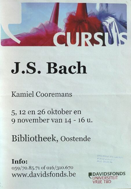 Affiche : Davidsfonds Universiteit Vrije Tijd. J. S. Bach. Bibliotheek Oostende. 5-12-26/10 en 9/11/....(?)