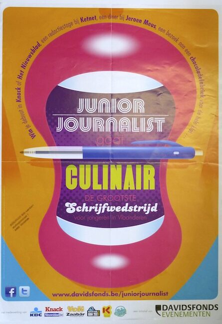 Affiche : Davidsfonds Evenementen. Junior journalist gaat culinair. Geen locatie meegedeeld. …. (?)