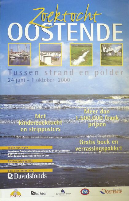 Affiche : Davidsfonds. Zoektocht Oostende. Tussen strand en polder. 24/06 tot 1/10/2000