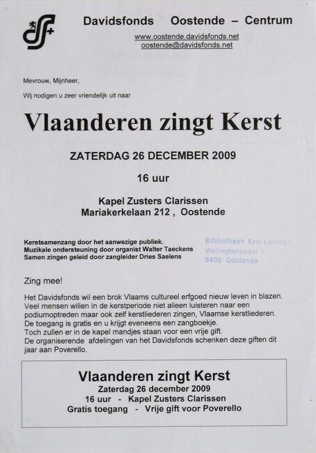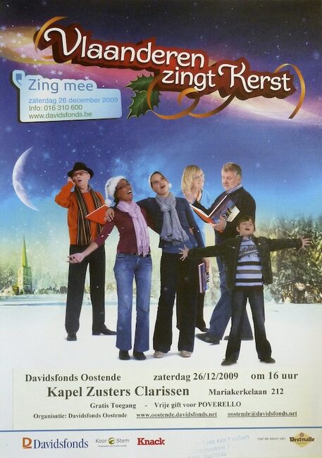 Affiche : Davidsfonds Oostende. "Vlaanderen zingt Kerst",.Kapel Zuster Clarissen. 26/12/2009.