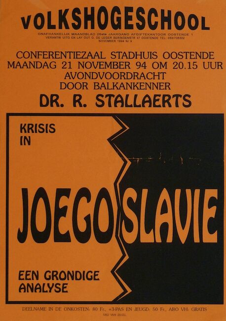Affiche : Volkshogeschool. Krisis in Joegoslavie: een grondige analyse. Conferentiezaal stadhuis Oostende. 21/11/1994