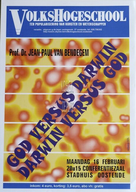 Affiche : Volkshogeschool. God versus Darwin, Darwin versus God. Conferentiezaal stadhuis Oostende. 16/02/....(?)
