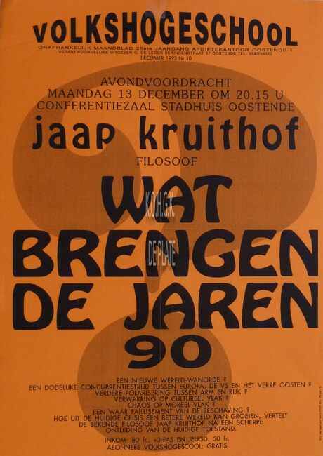 Affiche : Volkshogeschool. Wat brengen de jaren 90. Conferentiezaal stadhuis Oostende. 13/12/.…(?)
