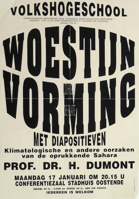 Affiche : Volkshogeschool. Woestijnvorming. Conferentiezaal stadhuis Oostende. 17/01/....(?)