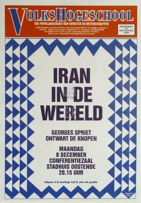 Affiche : Volkshogeschool. Iran in de wereld. Conferentiezaal stadhuis Oostende. 08/12/2008