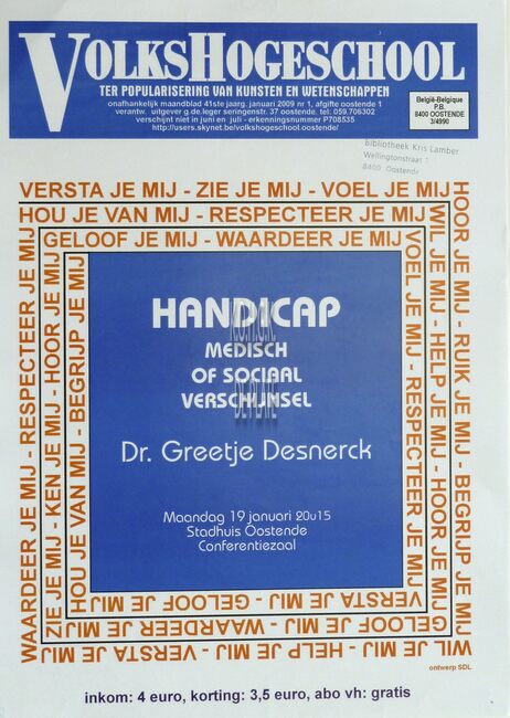 Affiche : Volkshogeschool. Handicap : medisch of sociaal verschijnsel. Conferentiezaal stadhuis Oostende. 19/01/2009