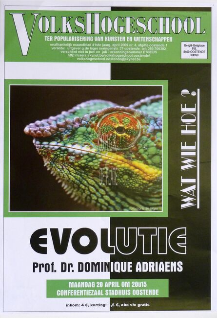 Affiche : Volkshogeschool. Evolutie : wat, wie, hoe?. Conferentiezaal stadhuis Oostende. 20/04/2009