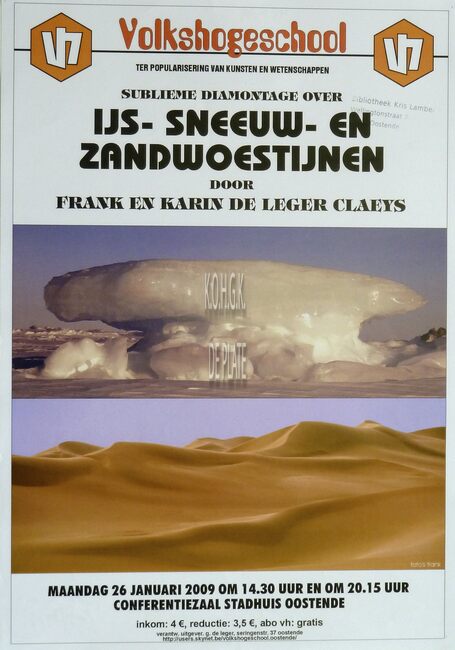 Affiche : Volkshogeschool. Ijs- Sneeuw- en Zandwoestijnen. Conferentiezaal stadhuis Oostende. 26/01/2009.