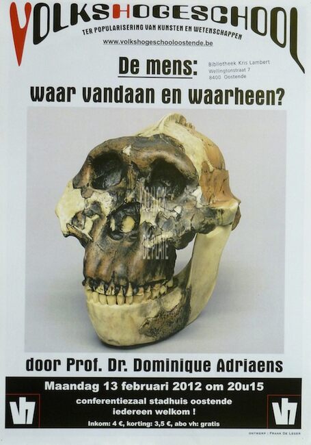 Affiche : Volkshogeschool. De mens : waar vandaan en waarheen?. Conferentiezaal stadhuis Oostende. 13/02/12.