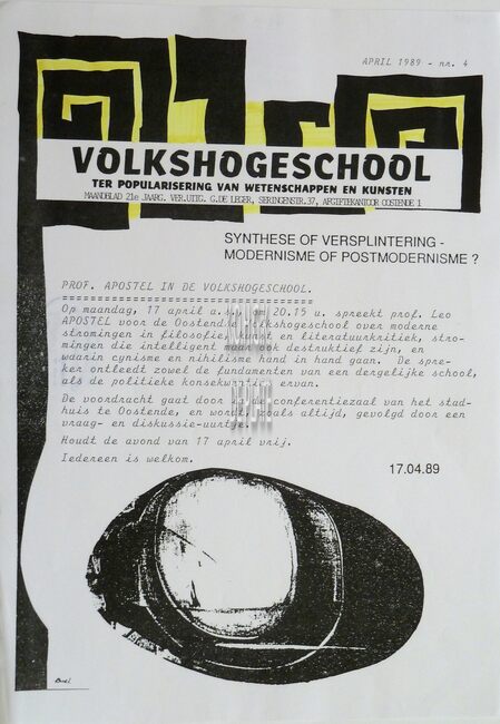 Affiche : Volkshogeschool. Synthetische of Versplintering. Modernisme of Postmodernisme. Conferentiezaal stadhuis Oostende. 17/04/1989.