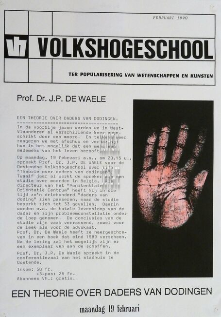 Affiche : Volkshogeschool. Een theorie over daders van dodingen. Conferentiezaal stadhuis Oostende. 19/02/1990