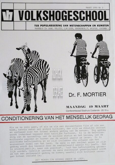 Affiche : Volkshogeschool. Conditionering van het menselijk gedrag. Conferentiezaal stadhuis Oostende. 19/03/1990.
