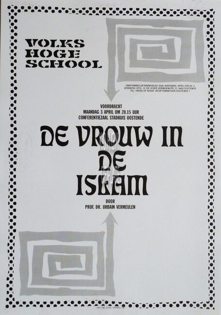 Affiche : Volkshogeschool. De vrouw in de Islam. Conferentiezaal stadhuis Oostende. 3/04/2000