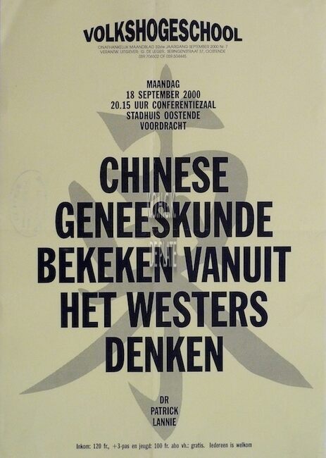 Affiche : Volkshogeschool. Chinese geneeskunde bekeken vanuit het Westers denken. Conferentiezaal stadhuis Oostende. 18/09/2000