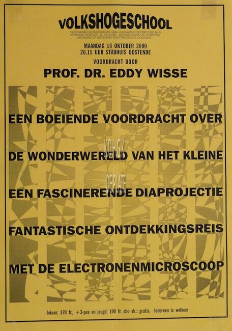 Formaat : 42 x30 cm. Een boeiende voordracht. Een fascinerende ontdekkingsreis met de electronenmicroscoop door prof. dr. Eddy Wisse.