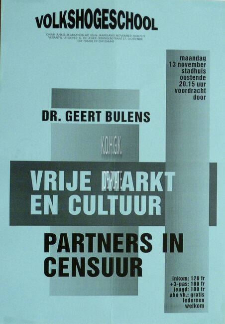 Affiche : Volkshogeschool. Vrije markt en cultuur : Partners in censuur. Conferentiezaal stadhuis Oostende. 13/11/2000.