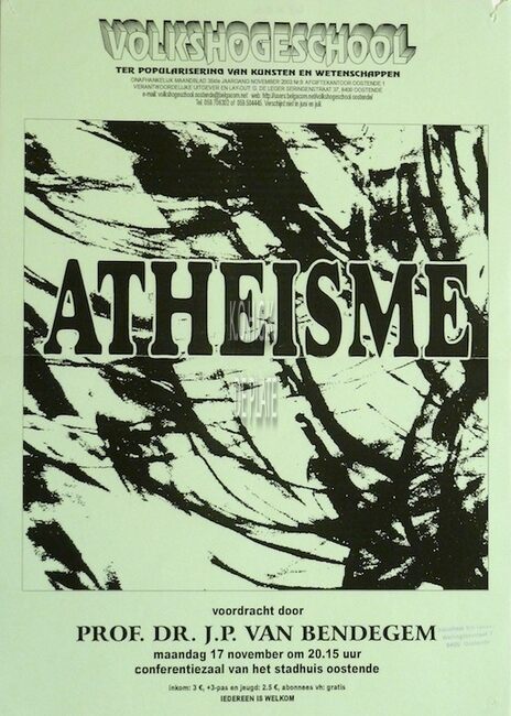 Affiche : Volkshogeschool. Atheïsme. Conferentiezaal stadhuis Oostende. 17/11/2003
