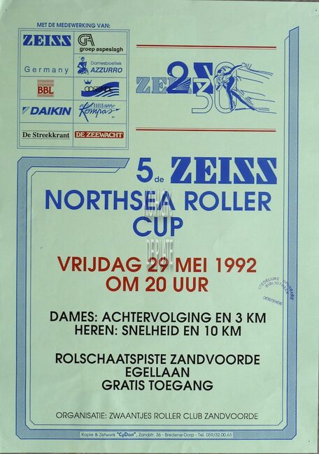 Affiche : ZWAANTJES ROLLER CLUB ZANDVOORDE. 5DE ZEISS NORTHSEA ROLLER CUP. ROLSCHAATSPISTE ZANDVOORDE EGELLAAN. VRIJDAG 29 MEI 1992.