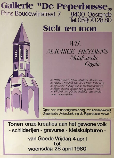 Affiche : Maurice Heydens. Schilderijen, gravures, kleiskulpturen. Tentoonstelling. Gallerie "De Peperbusse". Van 4 tot 28 april 1980