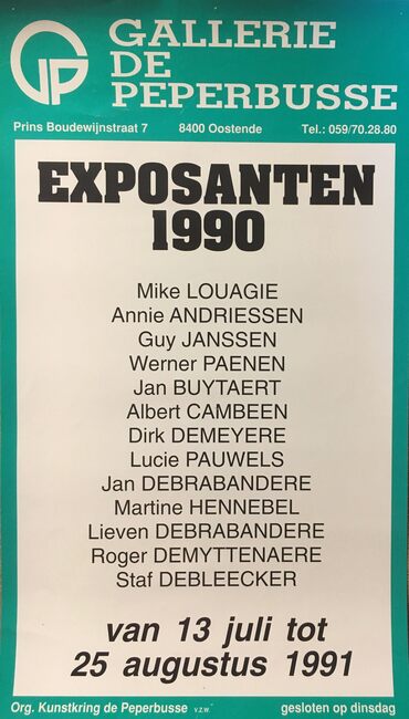 Formaat : 43 x 25 cm. Gallerie "De peperbusse". Prins Boudewijnstraat 7, 8400 Oostende. Organisatie "Kunstkring de Peperbusse". Met : Mike Louagie, Annie Andriessen, Guy Janssen, Werner paenen, Jan Buytaert, Albert Cambeen,…