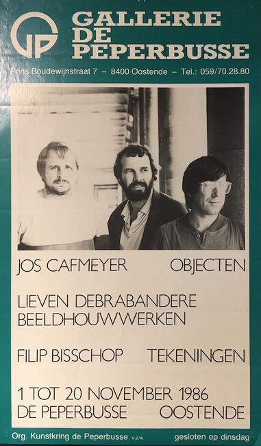 Affiche : Jos Cafmeyer. Objecten. Lieven Debrabandere. Beeldhouwwerken. Filip Bisschop. Tekeningen. Tentoonstelling. Gallerie De Peperbusse. Van 1 tot 20 november 1986