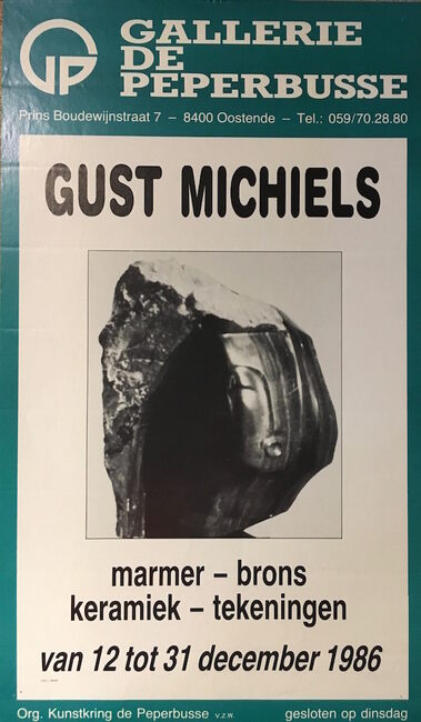 Affiche : Gust Michiels. Marmer, brons, keramiek, tekeningen. Tentoonstelling. Gallerie De Peperbusse. Van 12 tot 31 december 1986