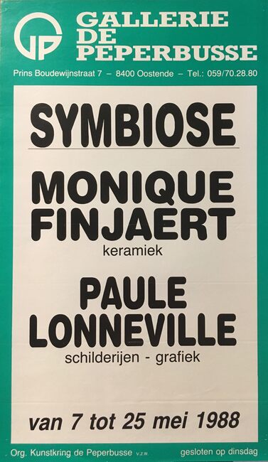 Affiche : Monique Finjaert. Keramiek. Paule Lonneville. Schilderijen, grafiek. Symbiose. Tentoonstelling. Gallerie De Peperbusse. Van 7 tot 25 mei 1988