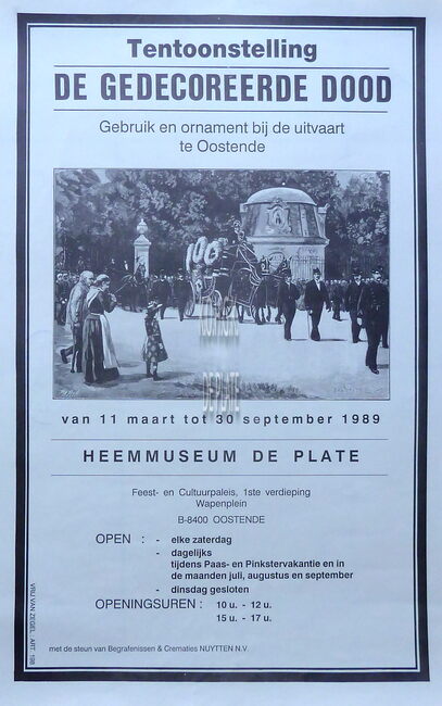 Affiche : De gedecoreerde dood. Tentoonstelling. Heemmuseum De Plate. Van 11 maart tot 30 september 1989