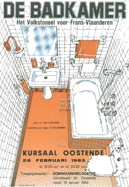 Affiche : Volkstoneel voor Frans Vlaanderen. 'De Badkamer'. Kursaal Oostende. 26 februari 1983