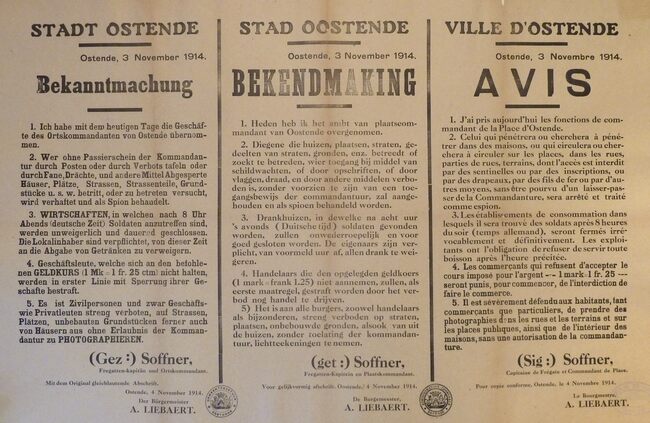 Formaat : 54 x 82 cm. Kennisgeving uitgaande van de burgemeester A.Liebaert van de onderrichtingen van de nieuwe Plaatscommandant Soffner betreffende, fotografie, wisselkoers, sluiting van drankhuizen en plaatsen met…