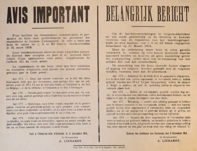 Tekstaffiche : Oproep aan de bevolking van Oostende = Appel à la population Ostendaise