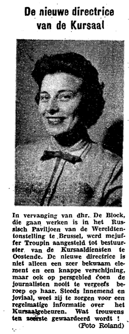 Trefwoorden CASINO-KURSAAL ; PERSONEEL TROUPIN HÉLÈNE (°1923-) (DIRECTRICE PERSONEEL KURSAAL) Plaatskenmerk O.D.P.-archieven. Bibliotheek Kris Lambert 25-12-1957 Bron Het Kustblad Pagina's 5,foto Print