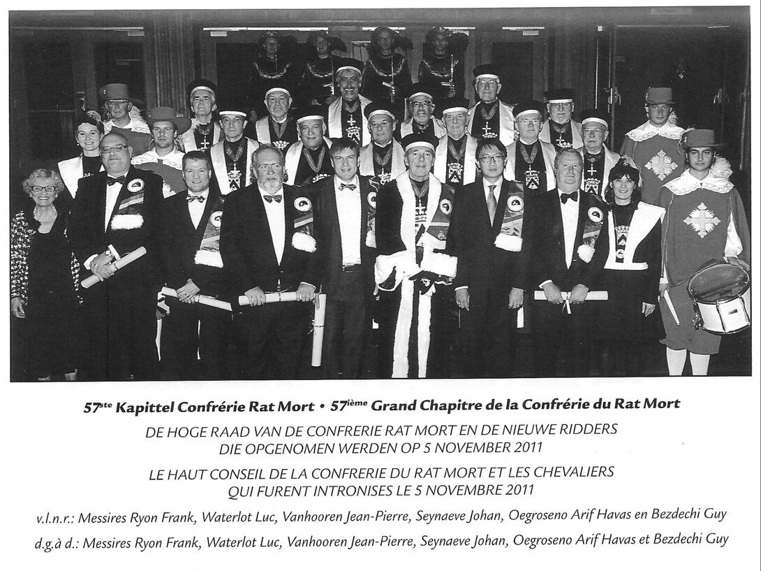 De nieuwe ridders geïntroniseerd bij de Hoge en Edele Confrerie Rat Mort Oostende. 05/11/2011