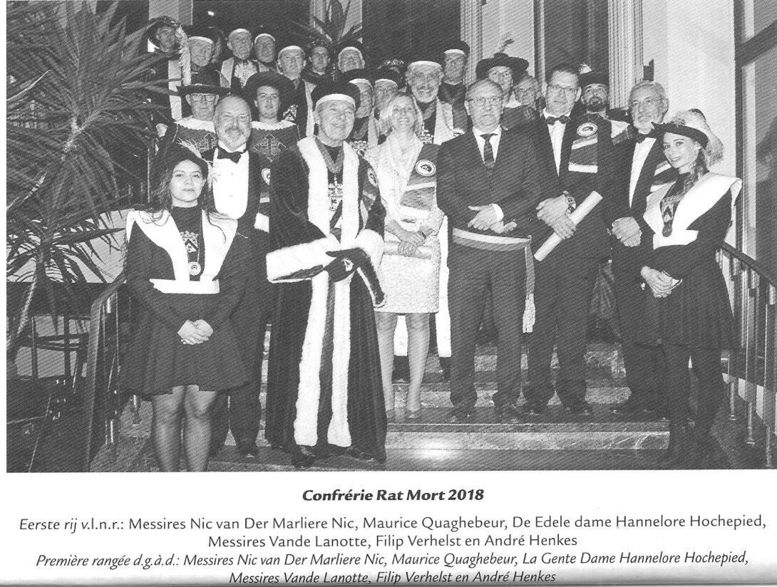 De nieuwe ridders geïntroniseerd bij de Hoge en Edele Confrerie Rat Mort Oostende. 2018